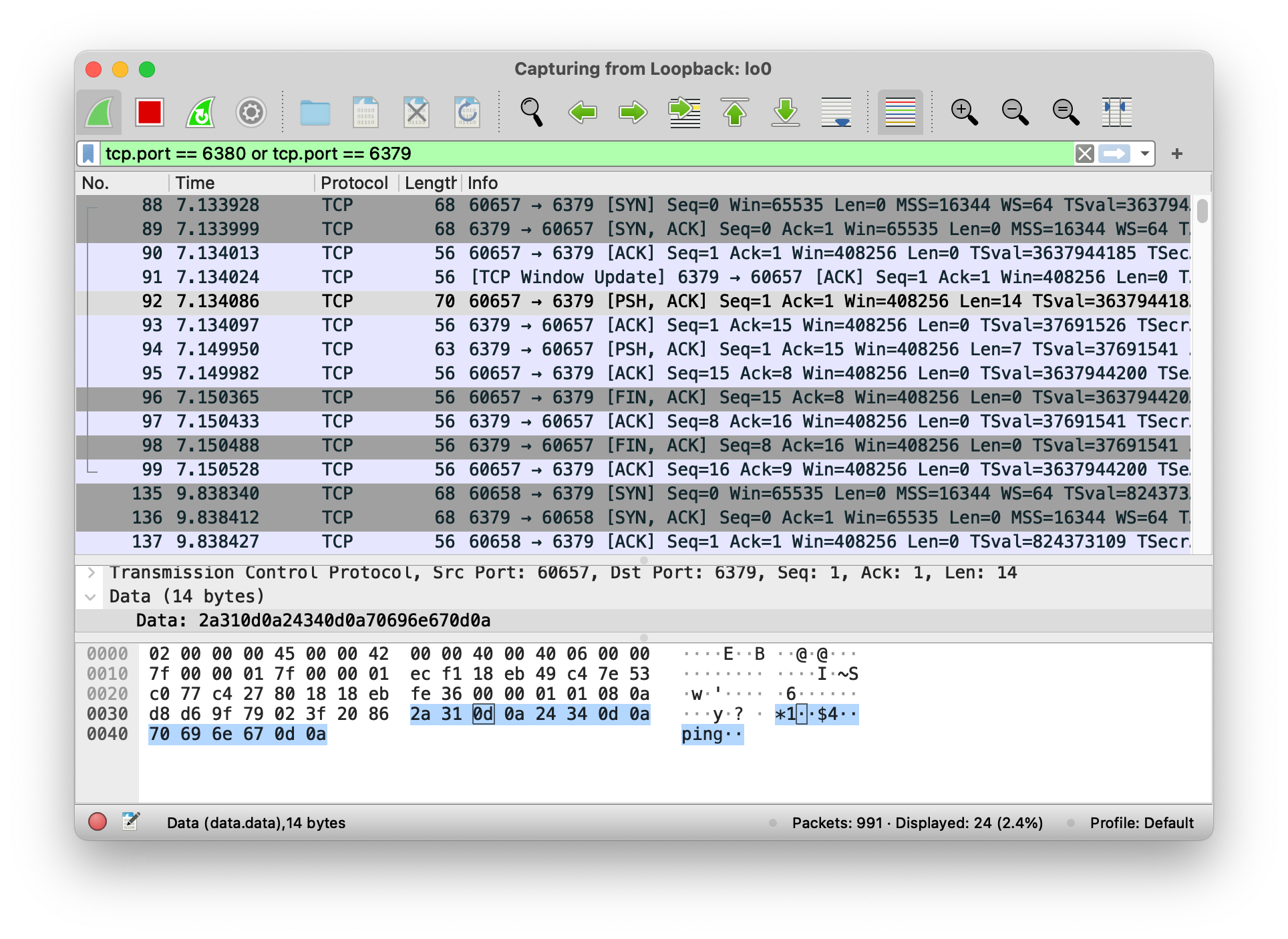 Since redis-cli & redis-server communicate with each over using TCP, we’ll need a tool to inspect TCP messages. Install Wireshark. If you prefer CLI tools you can also use tcpdump.Methodology