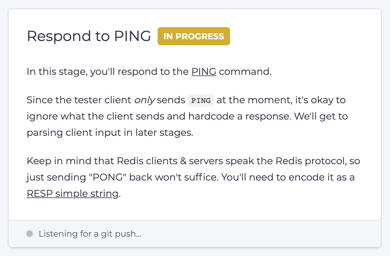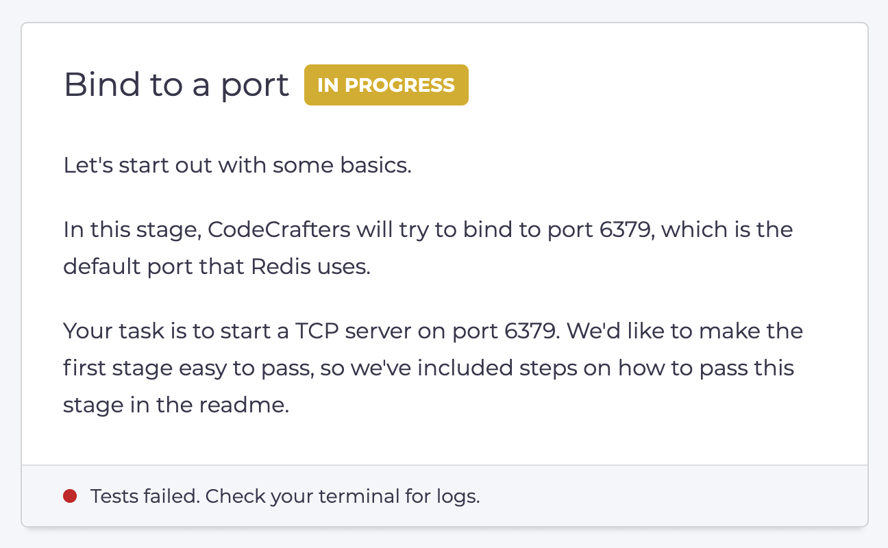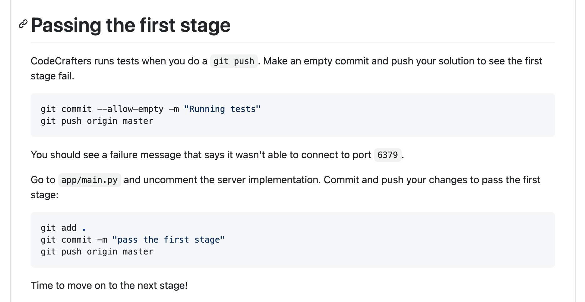 The README will contain instructions on how to pass the first stage. We always include this along with your starter repository, so that it’s easy to get started.